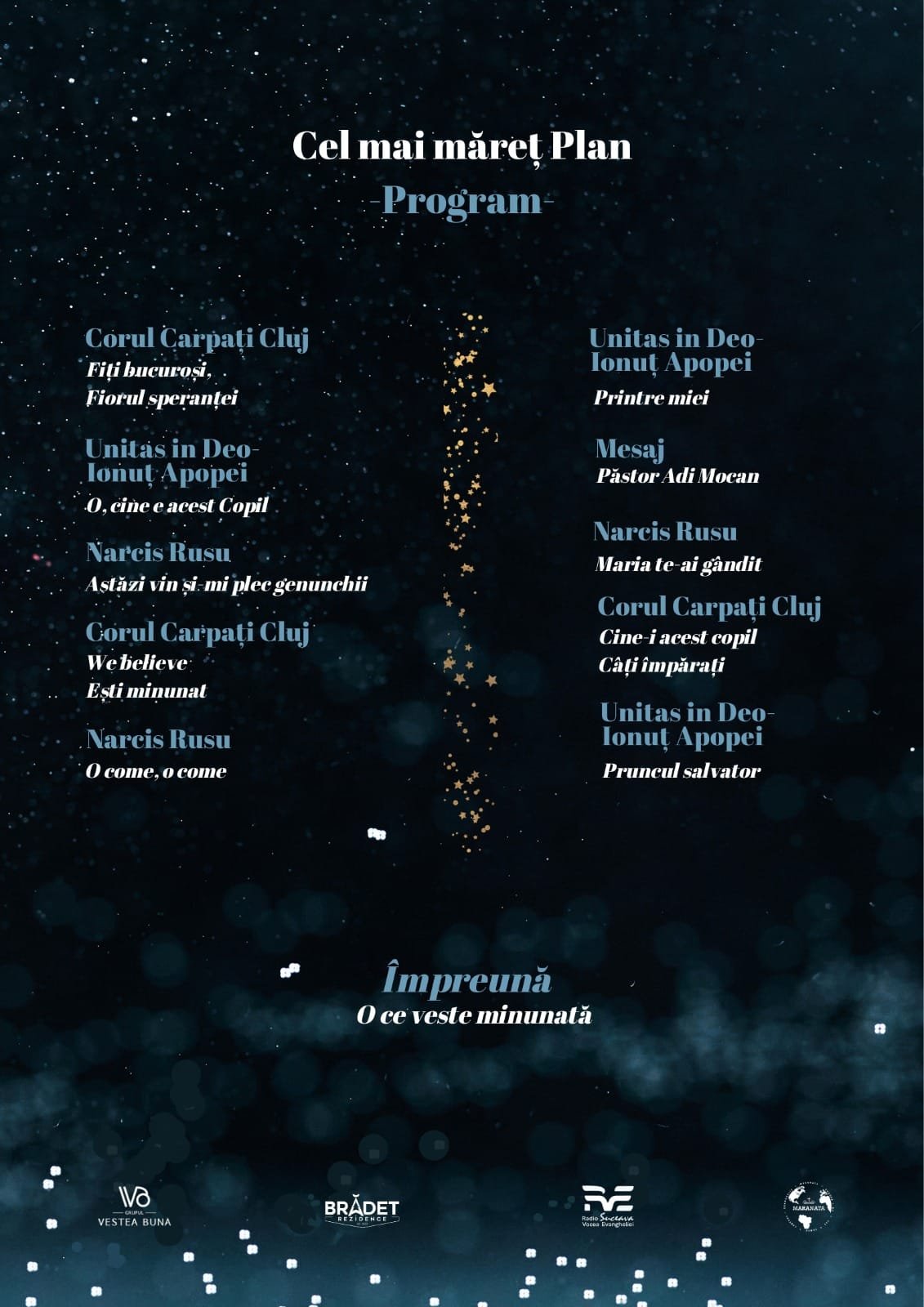 În 21 Decembrie 2024, ora 18:00 Casa de Cultură din Suceava va răsuna de bucuria colindelor în cadrul evenimentului „Cel mai măreț Plan”. Corul Carpați Cluj, alături de alți cântăreți precum Narcis Rusu, grupul Unitas in Deo, și predicatorul Adi Mocan vor fi prezenți pentru a transmite încă o dată Vestea Bună despre Nașterea Mântuitorului. Vă invităm să fiți alături de noi la acest eveniment unde intrarea va fi liberă.